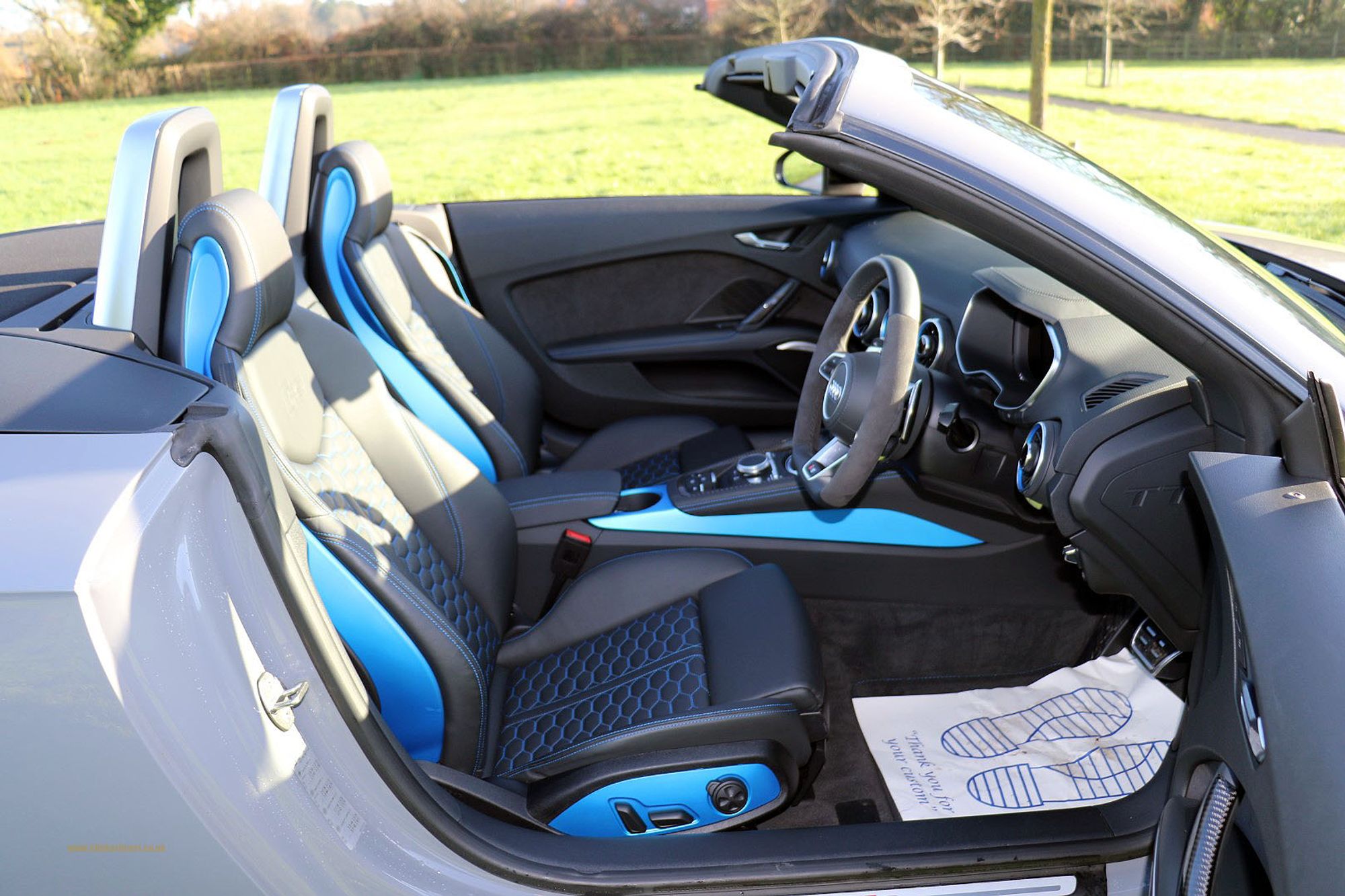 2019 '19' reg with 1,800 miles. Nardo Grey with Black Leather, Quilted Seats with Contrast Blue Stitching, Blue Centre Console, Sport Edition. 20" Diamond Cut 7 Spoke RS Wheels, Badge Decals in Black, Rear Spoiler with Gloss Black Finishers, Carbon Fibre Interior Trim, Navigation with Bluetooth and Phone Integration, Wireless Charging, Front and Rear Parking Sensors, Sports Exhaust, Cruise Control, Electric Folding and Heated Door Mirrors, Bang & Olufssen Surround Sound System. This is a Beautiful car and will come freshly serviced by Audi.