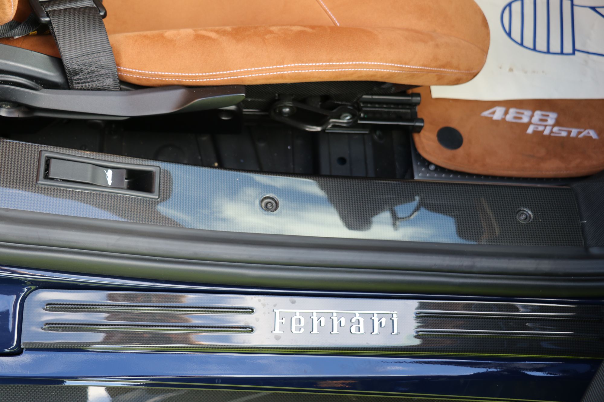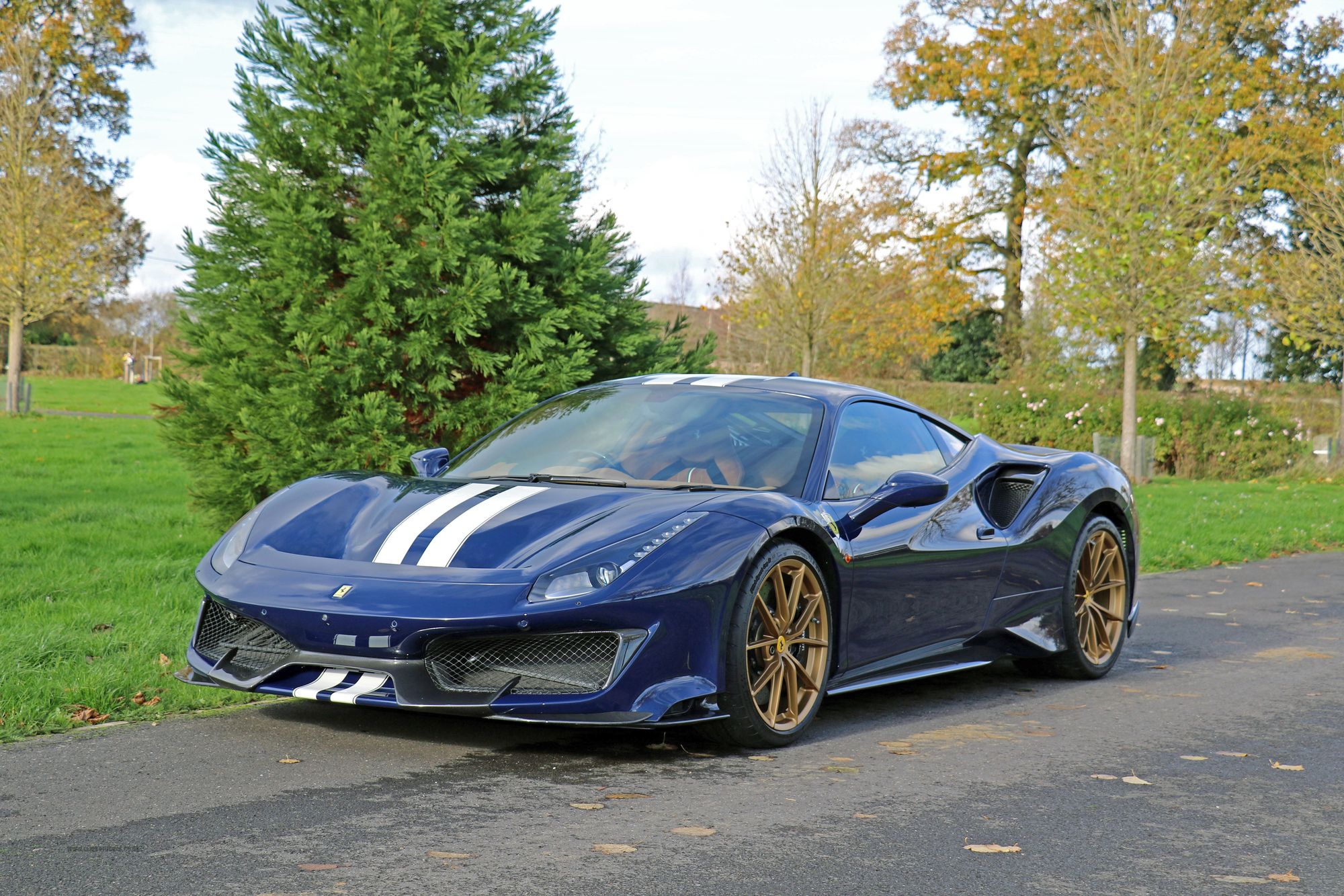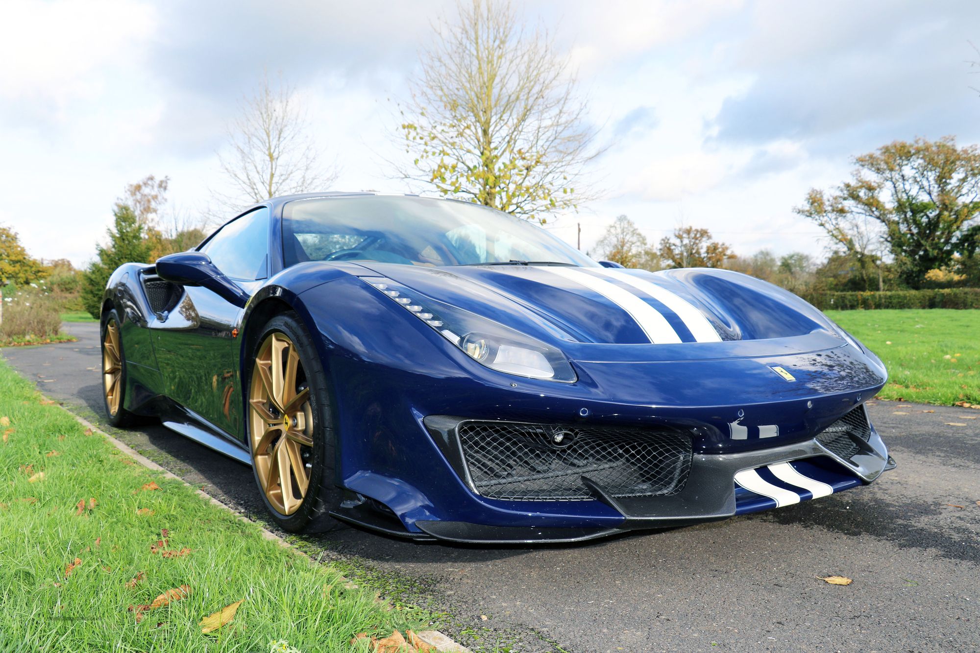 2019 '19' reg with 3388 miles. Ferrari Historic Colour Blu Scozia with Cuoio Alcantara and Bianco Contrast Stitching, Large Carbon Fibre Race Seats, Two Tone Stripe, 20" Forged Gold Rims, Nero Brake Calipers, Carbon Fibre Front Flaps, Front Air Vents in Carbon Fibre, Carbon Fibre Under Door Cover, Carbon Fibre Side Air Splitter, Carbon Fibre Rear Moulding, Rear Diffuser in Carbon Fibre, Engine Covers in Carbon Fibre, AFS System, Suspension Lifter, Interior and Exterior Automatic Dimming Mirrors, Front and Rear Parking Cameras, Black Ceramic Exhaust Pipes, Scuderia Ferrari Shields, High Emotion Low Emission, Personalisation Pack, Horse Stitched Head Rests in Bianco, Racing Seat Lifter, 4 Point Safety Harnesses, Coloured Mats with Logo, Alcantara Seats Inner Trim Cuoio, NavTrek Anti Theft System, Integrated Audio System, RadioNav System with Bluetooth, White Rev Counter, Carbon Fibre Upper Tunnel Trim, Carbon Fibre Inner Sill Trim. This is an Amazing looking car in this colour combination and was previously a celebrity owned Ferrari. It also has a full body liquid PPF protecting the lovely paintwork.
