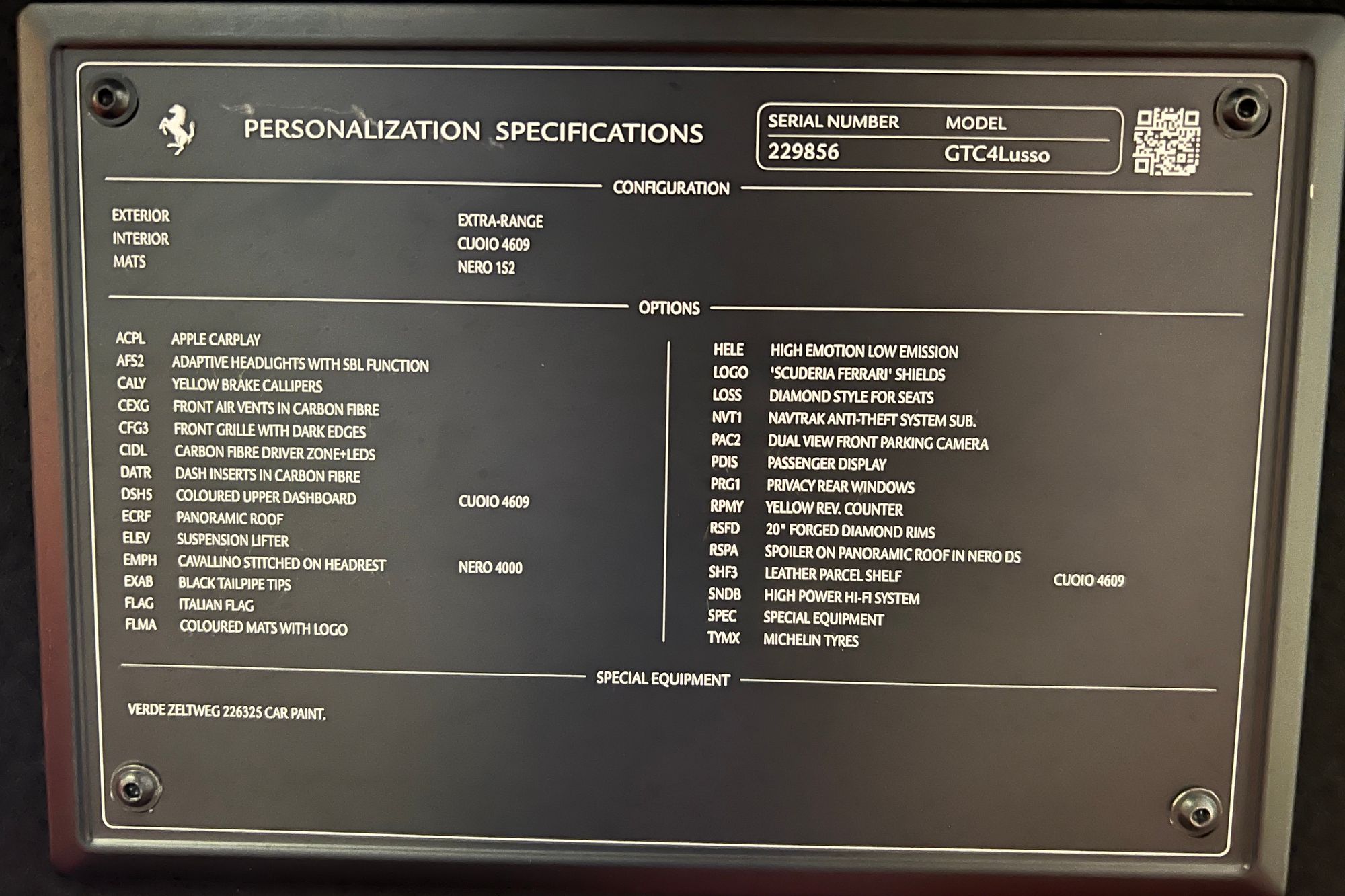 2017 '67' reg with 24,312 miles. Special Order British Racing Green Metallic with Cuoio Leather, Diamond Style Stitch, Apple Car Play, Adaptive Headlighs with SBL Function, Yello Brake Calipers, Front Air Vents in Carbon Fibre, Front Grille with Dark Edges, Carbon Fibre Driving Zone with LED Gear Change Lights, Dash Inserts in Carbon Fibre, Cuoio Upper Dash, Panoramic Glass Roof, Suspension Lifter, Cavallino Stitched on Head Rests in Nero Contrast Stitching, Black Tail Pipes, Italian Flag to Rear, Coloured Mats with Logo, Hi Emotion Low Emission, Scuderia Ferrari Sheilds, Navtrak Antio Theft System, Dual View Front Parking Camera, Passenger Display, Privacy Rear Windows, Yellow Rev Counter, 20" Forged Diamond Rims, Spoiler on Panoramic Roof in Nero DS, Cuoio Leather Parcel Shelf, High Power Hi Fi System. Full Body Clear PPF.