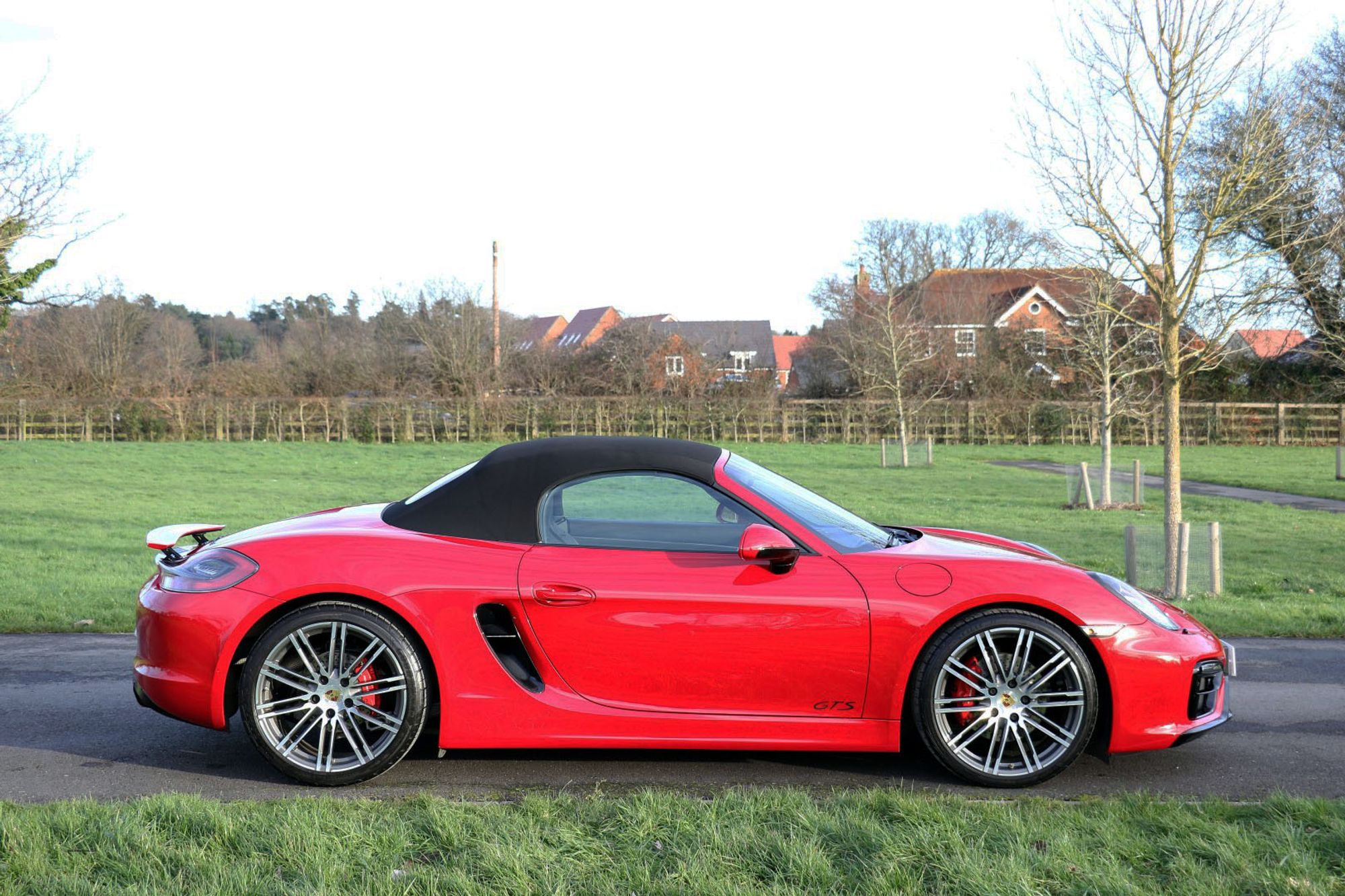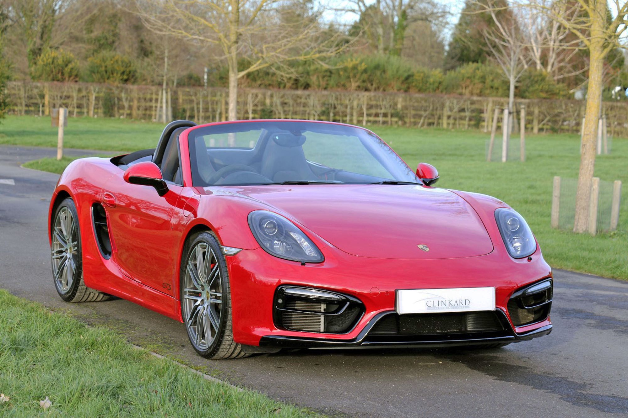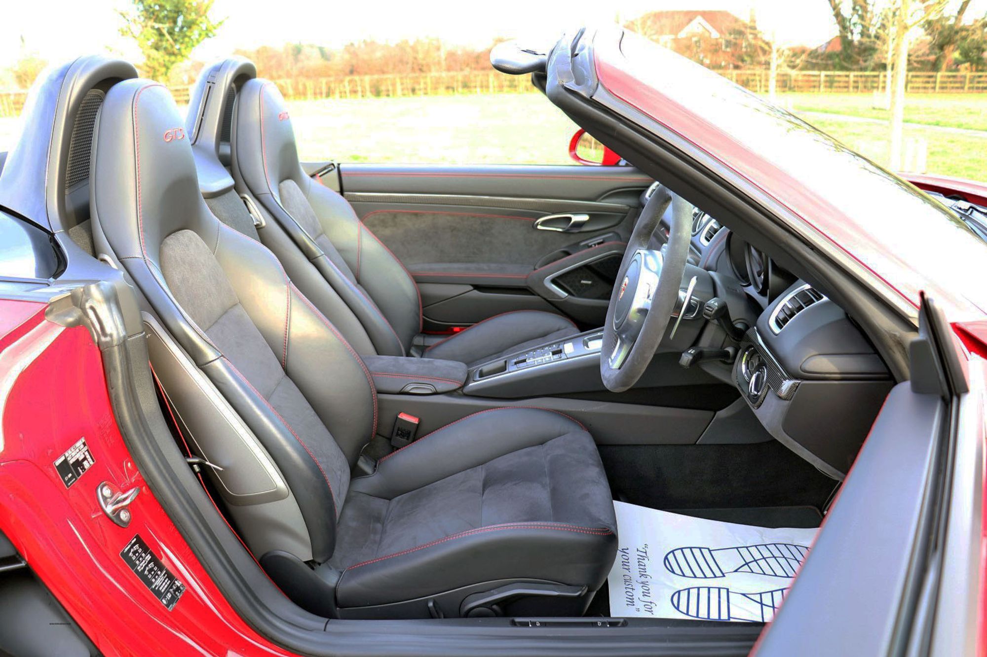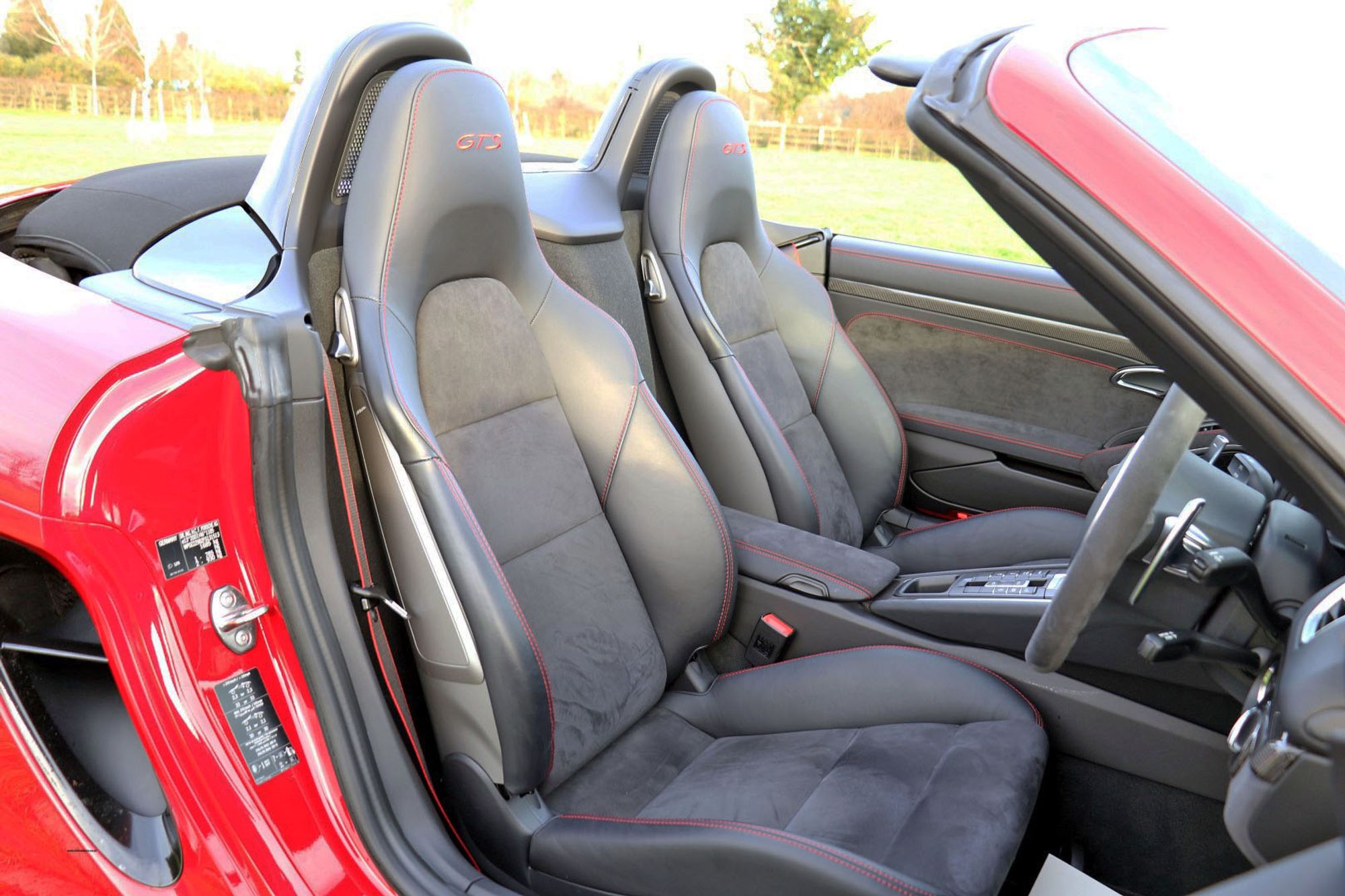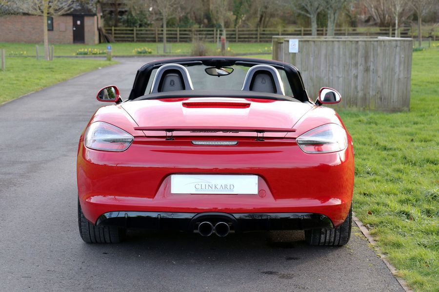 The Porsche Boxster range has undergone some significant changes in the latest 718 series, and one of the most major changes is the movement from the Horozontally Opposed 6 Cylinder Engines that have been the trademark with both 911's and Boxsters for 50 years give or take, to 4 cylinder turbo charged units. Whilst understanding the true spirit of keeping emmissions down and making these cars more fuel efficient, true Porsche enthusiasts may well argue that these newer models have lost something in this movement. There is joy to be had from the noise of the flat 6, and for the instant response one gets from the naturally aspirated 3.4 litre engine that this car is fitted with. This is a substantial engine with 330 bhp and 273lb.ft of torque, and it sits perfectly nice and low, and just forward of the rear wheels exactly where it should be for perfect weight distribution. It's a fantastic car to drive, and in GTS guise it is the last and best of this model. This is an End of Era car that could well prove to be a very interesting propsition in years to come, and in Carmine Red with black detailling it looks amazing.